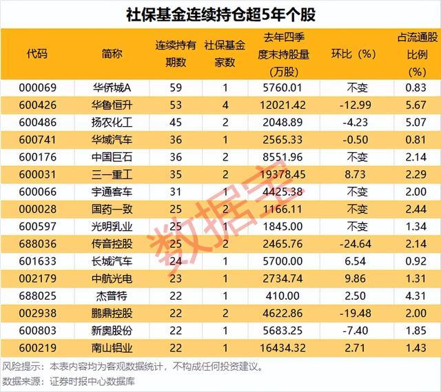 社保基金持有期限最长的个股是华侨城A,自2011年二季度以来已累计持有59个季度,最新全国社保基金四一三组合,位列公司第六大流通股东,持股量合计为5760.01万股,占流通股比例为0.83%,社保基金持有期限较长的还有华鲁恒升、扬农化工、中国巨石等,已连续持有53、45、36个季度。