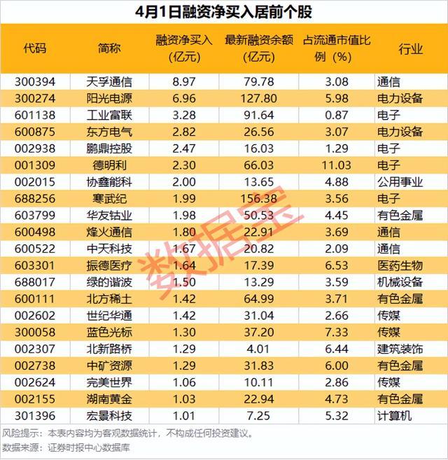 具体到个股,4月1日共有1838只股获融资净买入,净买入金额在千万元以上的有439只,其中21只融资净买入额超1亿元。天孚通信融资净买入额居首,当日净买入8.97亿元;其次是阳光电源、工业富联,融资净买入金额分别为6.96亿元、3.28亿元;融资净买入金额居前的还有东方电气、鹏鼎控股、德明利等。